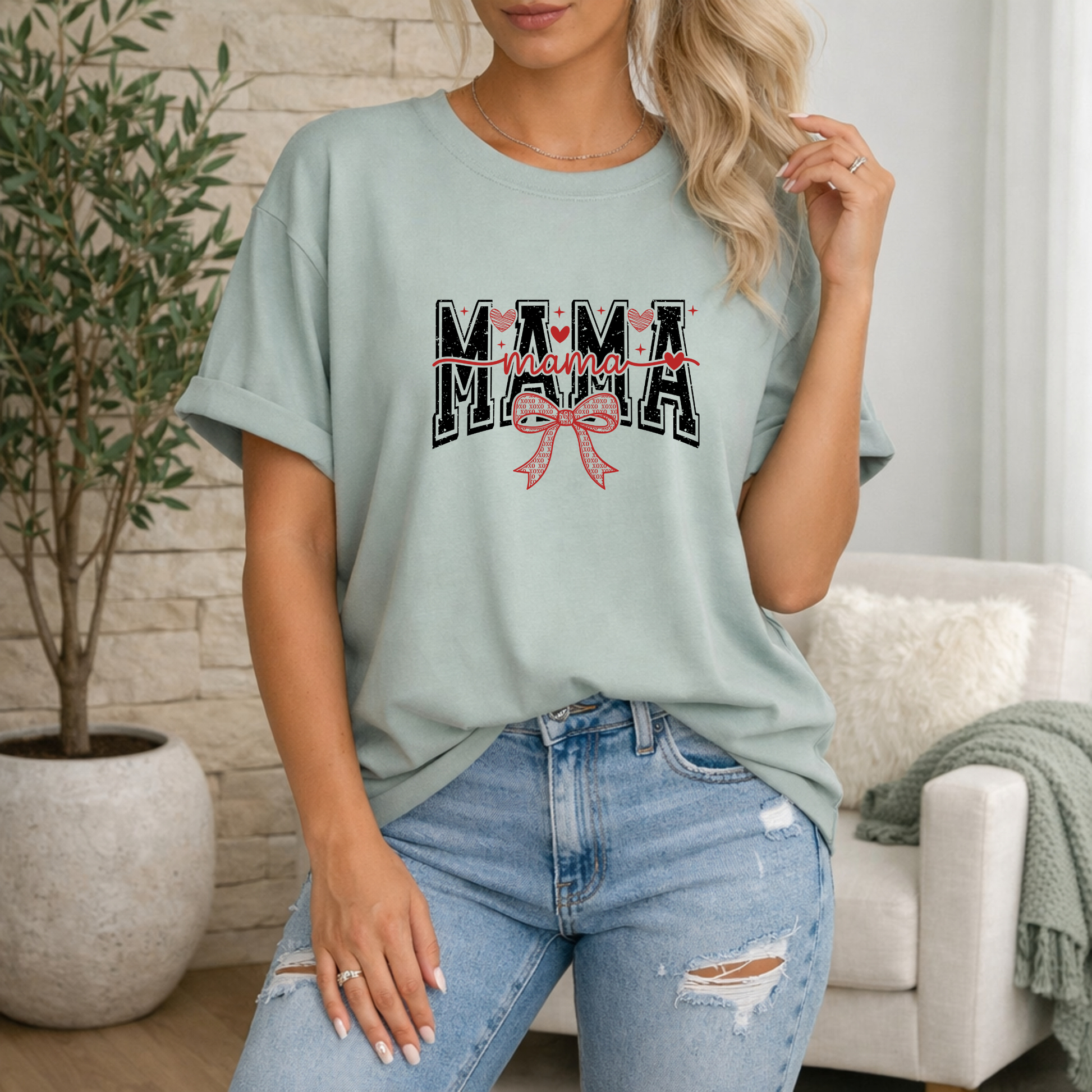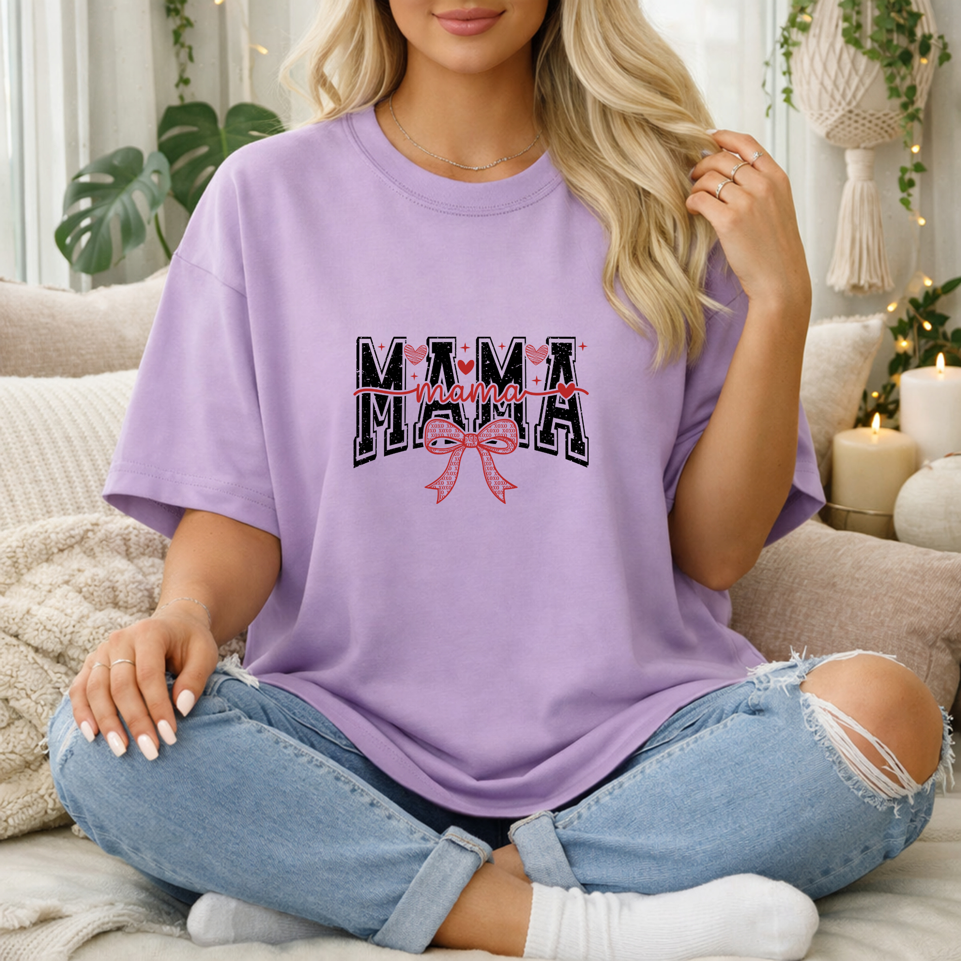 A relaxed statement piece for moms who like clean graphics with a soft feminine touch.